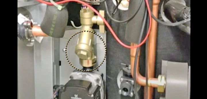 Mitsubishi Electric Ecodan ilma-vesilämpöpumpun sisäisen lianerottimen puhdistus.